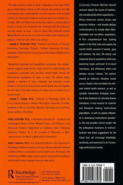 First published in 2003. The most comprehensive book on the topic of multicultural mental health, Culturally Diverse Mental Health addresses the challenge of counseling diverse populations including multiracial, homosexual, geriatric, and disabled individuals. Because many clients of diverse backgrounds have entered therapy in the last two decades, old models of treatment based on the mainstream majority no longer apply. This book compiles the latest research on a widely diverse number of populations and addresses the issue of resistance to the need to modify old practices to apply to these populations.