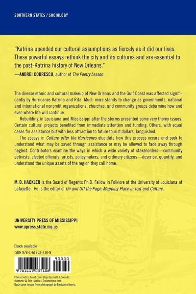 Essays examining the fraught negotiations between off icial agencies and loc al comm unities in the aftermath of disasters Essays by Jay D. Edwards, Keagan LeJeune, Benjamin Morris, Jeffrey Schwartz, Peter G. Stillman, Adelaide H. Villmoare, and W. D. Wilkerson Rebuilding in Louisiana and Mississippi after Hurricanes Katrina and Rita presented some very thorny issues. Certain cultural projects benefited from immediate attention and funding while others, with equal cases for assistance but with less attraction to future tourist dollars, languished. New Orleans and its surroundings contain a diverse mixture of Native Americans, African Americans, Creoles, Cajuns, Isleños with roots in the Canary Islands, and the descendants of Italian, Irish, English, Croatian, and German immigrants, among others. Since 2005 much is now different for the people of the Gulf Coast, and much more stands to change as governments, national and international nonprofit organizations, churches, and community groups determine how and even where life will continue. This collection elucidates how this process occurs and seeks to understand the cultures that may be saved through assistance or may be allowed to fade away through neglect. Essays in Culture after the Hurricanes examine the ways in which a wide variety of stakeholders--community activists, elected officials, artists, and policy administrators--describe, quantify, and understand the unique assets of the region. Contributors question the process of cultural planning by analyzing the language employed in decision making. They attempt to navigate between rhetoric and the actual experience of ordinary citizens, examining the long-term implications for those who call the Gulf Coast home.