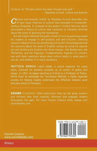 [Culture is] "the best which has been thought and said." -Matthew Arnold, Culture and Anarchy Culture and Anarchy (1869) by Matthew Arnold describes one of two major theories of culture that emerged in nineteenth-century England. It is based on the author's Oxford lectures which articulated a theory of culture that continues to influence thinking about the value of teaching the humanities. Arnold's book reflected the public mood of his time and encouraged his readers to engage in self-analysis and self-criticism. Defining culture in idealist terms (as something to strive for) Arnold popularized his concerns about the state of English society by using his natural wit and dividing the English into three classes-the Barbarians, the Philistines, and the Populace. Fundamentally, however, his concern was with basic questions about what culture really is, what good it can do, and whether it is really necessary.