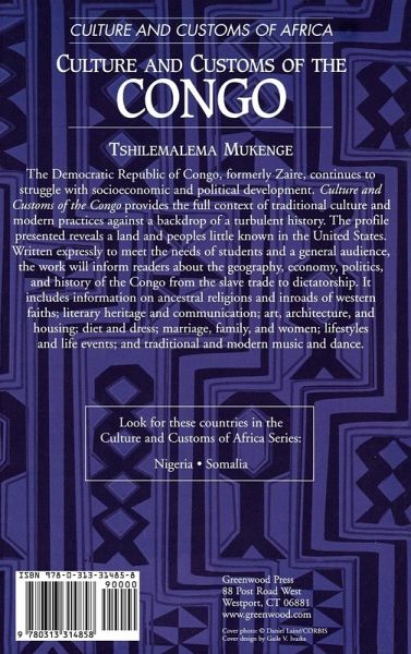 The Democratic Republic of Congo, formerly Zaire, continues to struggle with socioeconomic and political development. Culture and Customs of the Congo provides the full context of traditional culture and modern practices against a backdrop of a turbulent history. The volume opens up a land and peoples little known in the United States. Written expressly to meet the needs of students and the general audience, the work will inform about the geography, economy, political history, and history from the slave trade to dictatorship; ancestral religions and inroads of western faiths; ancestral literary heritage and communication; art, architecture, and housing; diet and dress; marriage, family, and women; lifestyles and life events, and traditional and modern music and dance. Congolese society comprises hundreds of ethnic groups, such as the Luba, the Kongo, and the Kuba. The countryside is largely based on the hunting and gathering, herding, and farming lifestyles. The city is marked by lifestyles reflecting the prevalence of small business activities and increasing cultural sycretism of customs from different parts of the Congo and Western imports. Mukenge's narrative gives the diverse perspectives of their cultures with their fascinating juxtapositions to our familiar western ways. Examples of this are found in the Religion and Worldview chapter, which discusses ancestral religions, the spirits of the land, and supernatural power practitioners. The Literature chapter covers verbal competition and game songs. Congolese cuisine is based on starches such as the cassava root, the corn, and the plantain; green vegetables, insects, fish and, to a lesser extent, meat. Other chapters cover topics from the distinct Congolese dress and symbolic adornments, all-important family lines, to ceremonial music and dance. A chronology and glossary are added value.