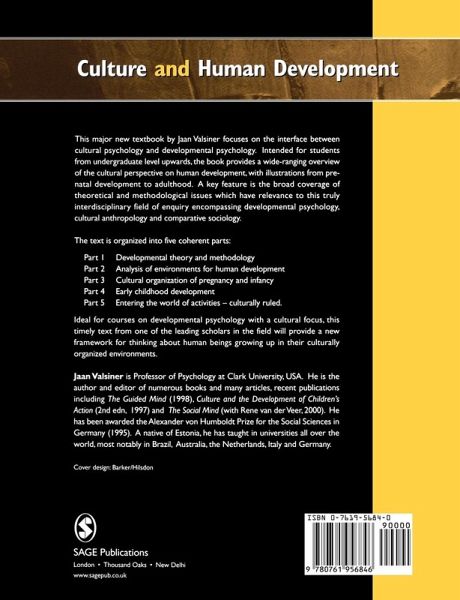 This major new textbook by Jaan Valsiner focuses on the interface between cultural psychology and developmental psychology. Intended for students from undergraduate level upwards, the book provides a wide-ranging overview of the cultural perspective on human development, with illustrations from pre-natal development to adulthood.A key feature is the broad coverage of theoretical and methodological issues which have relevance to this truly interdisciplinary field of enquiry encompassing developmental psychology, cultural anthropology and comparative sociology.