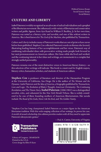 Isabel Paterson is widely recognized as an advocate of radical individualism and a prophet of the libertarian movement. She influenced a wide variety of libertarian and conservative writers and public figures, from Ayn Rand to William F. Buckley, Jr. In her own time, Paterson was noted as a literary critic and novelist, and one of the wittiest writers in America. She is best known for The God of the Machine, also published by Transaction. Culture and Liberty includes many of Paterson's works that are out of print or have never before been published. Stephen Cox collected Paterson's words on themes she favored, illustrating leading features of her accomplishments and her views. Paterson's way of combining individualist ideas with provocative writing made people look forward to her next pronouncement on American culture. Her fame while she lived and worked and the continuing interest in her ideas and writing are monuments to a complex but strongly unified personality. Paterson remains one of the most distinctive voices in American literary history-as this selection of her writings will indicate. This book is a must read for English majors, literary critics, humanities scholars, and students of American culture.