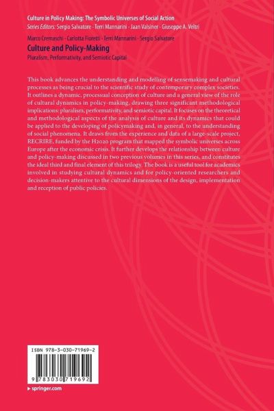 This book advances the understanding and modelling of sensemaking and cultural processes as being crucial to the scientific study of contemporary complex societies. It outlines a dynamic, processual conception of culture and a general view of the role of cultural dynamics in policy-making, drawing three significant methodological implications: pluralism, performativity, and semiotic capital. It focuses on the theoretical and methodological aspects of the analysis of culture and its dynamics that could be applied to the developing of policymaking and, in general, to the understanding of social phenomena. It draws from the experience and data of a large-scale project, RECRIRE, funded by the H2020 program that mapped the symbolic universes across Europe after the economic crisis. It further develops the relationship between culture and policy-making discussed in two previous volumes in this series, and constitutes the ideal third and final element of this trilogy. The book is a usefultool for academics involved in studying cultural dynamics and for policy-oriented researchers and decision-makers attentive to the cultural dimensions of the design, implementation and reception of public policies.