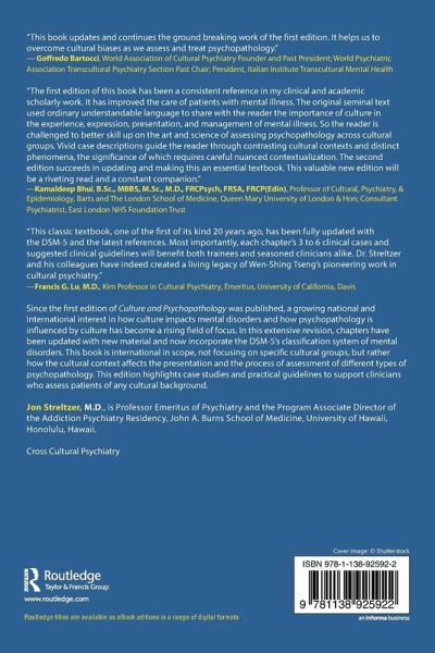 Preface: A tribute to Wen-Shing Jon Streltzer 1. Overview: Culture and Psychopathology Wen-Shing Tseng 2. Mood disorders Leslie Matsukawa 3. Suicide Deborah Goebert and Daryl Matthews 4. Traumatic Stress and adjustment disorders J. Onoye and J. Spira 5. Psychopathology associated with immigration, refugee status, and acculturation J. David Kinzie 6. Substance Use Disorders William Haning 7. Somatic Symptom Disorders Gretchen Gavero and Joy Andrade 8. Pain Jon Streltzer 9. Psychotic Disorders Abhishek Mehra and Junji Takeshita 10. Personality Disorders Steven R. Williams 11. Child and Adolescent Psychopathology Shaylin Chock and Anthony P S Guerrero 12. Geriatric Psychopathology June C. Lee and Iqbal Ahmed 13. Family Psychopathology Amanda Schroepfer O'Kelly and Anthony P. S Guerrero 14. Integration and Conclusions Wen-Shing Tseng and Jon Streltzer Index