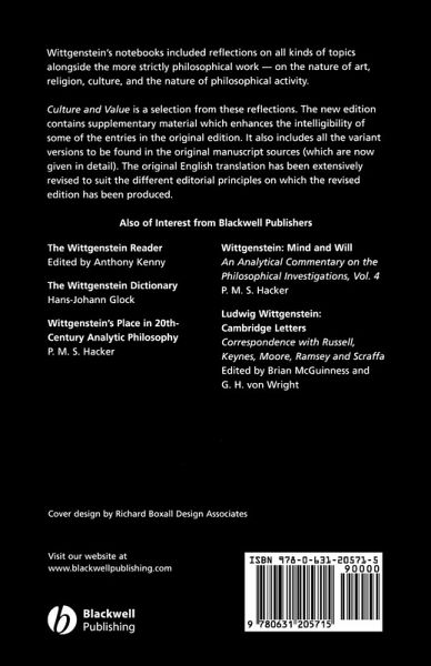 Completely revised throughout, Culture and Value is a selection from Wittgensteina s notebooks ---- on the nature of art, religion, culture, and the nature of philosophical activity.
