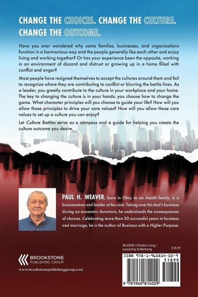 Change the choices. Change the culture. Change the outcome. Have you ever wondered why some families, businesses, and organizations function in a harmonious way and the people generally like each other and enjoy living and working together? Or has your experience been the opposite, working in an environment of discord and distrust or growing up in a home filled with conflict and anger? Most people have resigned themselves to accept the cultures around them and fail to recognize where they are contributing to conflict or blurring the battle lines. As a leader, you greatly contribute to the culture in your workplace and your home. The key to changing the culture is in your hands: you choose how to change the game. What character principles will you choose to guide your life? How will you allow those principles to drive your core values? How will you allow those core values to set up a culture you can enjoy? Let Culture Battles serve as a compass and a guide for helping you create the culture outcome you desire.
