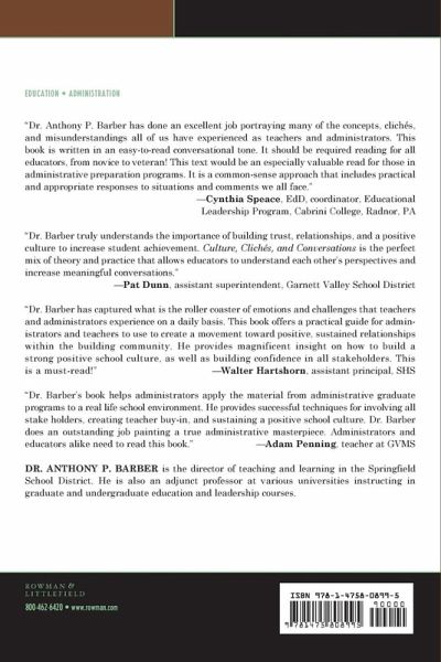 In today's school systems, educational clichés are ending essential dialogue when they should begin and maintain it. Messages like "That's why you make the big bucks" or "It is what it is" hinder our capacity to construct critical connections with each other. The focus of Clichés, Conversations and Culture: Cultivating Relations Between Teachers and Administrators is to unveil these clichés and explore alternatives that will foster connectedness.