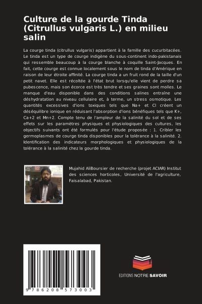 La courge tinda (citrullus vulgaris) appartient à la famille des cucurbitacées. Le tinda est un type de courge indigène du sous-continent indo-pakistanais qui ressemble beaucoup à la courge blanche à coquille Saint-Jacques. En fait, cette courge est connue localement sous le nom de tinda d'Amérique en raison de leur étroite affinité. La courge tinda a un fruit rond de la taille d'un petit navet. Elle est récoltée à l'état brut lorsqu'elle vient de perdre sa pubescence, mais son écorce est très tendre et ses graines sont molles. Le manque d'eau disponible dans des conditions salines entraîne une déshydratation au niveau cellulaire et, à terme, un stress osmotique. Les quantités excessives d'ions toxiques tels que Na+ et Cl créent un déséquilibre ionique en réduisant l'absorption d'ions bénéfiques tels que K+, Ca+2 et Mn+2. Compte tenu de l'ampleur de la salinité du sol et de ses effets sur les paramètres physiques et physiologiques des cultures, les objectifs suivants ont été formulés pour l'étude proposée : 1. Cribler les germoplasmes de courge tinda disponibles pour la tolérance à la salinité. 2. Identification des indicateurs morphologiques et physiologiques de la tolérance à la salinité chez la gourde tinda.
