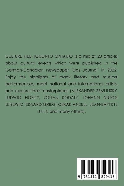 CULTURE HUB TORONTO ONTARIO is a mix of 20 articles about cultural events which were published in the German-Canadian newspaper "Das Journal" in 2022. Enjoy the highlights of many literary and musical performances, meet national and international artists, and explore their masterpieces (ALEXANDER ZEMLINSKY, LUDWIG HOELTY, ZOLTAN KODALY, JOHANN ANTON LEISEWITZ, EDVARD GRIEG, OSKAR ANSULL, JEAN-BAPTISTE LULLY, and many others).
