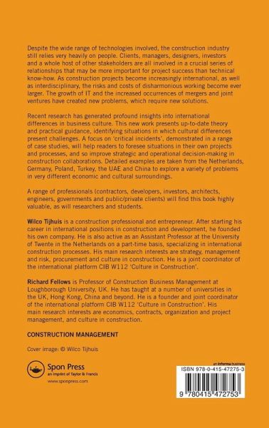 Despite the wide range of technologies involved, the construction industry still relies heavily on one old-fashioned component: the human. The clients, managers, designers, investors, and a whole host of other stakeholders are all involved in a crucial series of relationships that are just as important to project success as technical know-how. As construction projects become increasingly international as well as interdisciplinary, the risk and cost of disharmonious working grows ever larger. The growth of IT and the increased reliance on large mergers and joint-ventures have created new problems, which require a new set of solutions. Recent research has generated profound insights into international differences in business culture. This new work presents up-to-date theory and practical guidance, identifying situations in which cultural differences present challenges. A focus on "critical incidents", demonstrated in a range of case studies will help readers to foresee such situations in their own projects and processes, and so improve strategic and operational decision-making in construction collaborations. Detailed examples are taken from the Netherlands, Germany, Poland, Turkey, the UAE, and China, to explore a variety of problems in very different economic and cultural surroundings. A range of professionals (contractors, developers, investors, architects, engineers, governments, public/private clients) will find this book highly valuable, as will researchers and students.