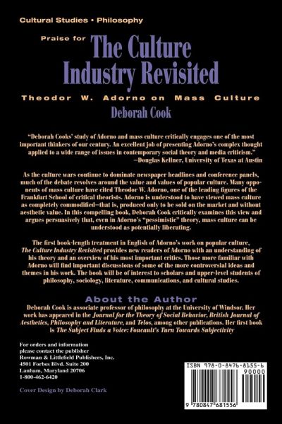 As the culture wars continue to dominate newspaper headlines and conference panels, much of the debate revolves around the value of and values in popular culture. Many opponents of popular culture have cited Theodor W. Adorno, one of the leading figures of the Frankfurt School of critical theorists. Adorno is understood to have viewed mass culture as completely commodified-that is, produced only to be sold on the market and without aesthetic value. In this compelling book, Deborah Cook critically examines this view and argues persuasively that even Adorno's "pessimistic" theory leaves room for resistance to the culture industry. Beginning with an exploration of the theoretical background for Adorno's work, Cook then examines Adorno's conception and criticism of mass culture and its consumption, and his views about art and its relation to mass culture. The first book-length treatment in English of Adorno's work on popular culture, The Culture Industry Revisited provides new readers of Adorno with an understanding of his theory and an overview of his more important critics. Those more familiar with Adorno will find important discussion of some of the more controversial ideas in his work. The book will be of interest to scholars and upper-level students of philosophy, sociology, literature, communications, and cultural studies.