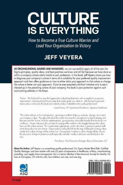 Culture IS Everything. As organizational leaders and managers, we can successfully apply all of the Lean Six Sigma principles, quality ideas, and best practices we know and still fail because we have done so within a company culture utterly hostile to such endeavors. In this book, Jeff Veyera shows you how to diagnose your company's culture in terms of its suitability for your preferred quality improvement approach and then offers guidance on how to either tailor your approach to that culture or change the culture to better suit your approach. If you've ever executed a brilliant initiative only to see it chewed up in the prevailing culture of your company, this book is your protection against such soul-crushing setbacks in the future. The first book I've seen that approaches cultural transformation with an emphasis on process improvement, including rational how-to steps that quality geeks can relate to Jeff sharing his personal stories adds a richness to this book and certainly makes it relatable to the quality professional. The author delivers on his initial promise providing a toolkit to help you evaluate, change, and sustain your company culture. Throughout the book the author discusses the concepts and a logical strategy and then provides the & how-to tools for implementation, giving readers actionable benefits from the book, not just theory. Veyera introduces the concept of using guerrilla warfare in the struggle between the culture lived and the culture desired. This is particularly appropriate, as the old culture is geared to protect itself, not to bring about its own demise. Organizations continually fall into the trap of letting the existing culture dictate how culture change will be carried out. Having been involved in a few change efforts, I found the discussion of steps to protect yourself especially valuable. I really could have used that back in the day.