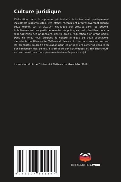 L'éducation dans le système pénitentiaire brésilien était pratiquement inexistante jusqu'en 2014. Des efforts récents ont progressivement changé cette réalité, car la situation chaotique qui prévaut dans les prisons brésiliennes est en partie le résultat de politiques mal planifiées pour la resocialisation des prisonniers, dont le droit à l'éducation a un grand poids. Dans ce livre, nous étudions la culture juridique de deux populations d'étudiants de l'Université fédérale du Maranhão, en nous concentrant sur les préceptes du droit à l'éducation pour les prisonniers contenus dans la loi sur l'exécution des peines. Il s'adresse aux sociologues et aux chercheurs en droit, ainsi qu'à toute personne intéressée par ce sujet.