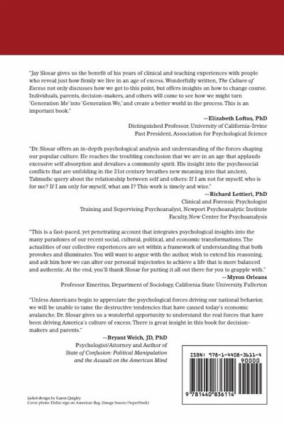 In the wake of the 2008-2009 economic recession, this revealing work offers a psychological explanation of how we as a nation grapple with self-control and how we can develop a new and healthier generation. As J.R. Slosar shows in this urgent, sometimes startling volume, the nation's fast-and-loose approach to money was in fact a symptom of a more widespread pattern of excessive behavior. In The Culture of Excess: How America Lost Self-Control and Why We Need to Redefine Success, Slosar portrays an America where the drive to succeed and the fear of missing out manifested itself not only in self-entitled corporate fraud, but in everything from sharp rises in obesity and cosmetic medical procedures to equally troubling increases in eating disorders, panic attacks, and outbreaks of uncontrollable rage. The Culture of Excess is the first book to assess the impact of economic and social factors on the nation's psychological well-being. Narcissism, productive narcissism, psychopathy, rigidity and self destruction, perfectionism, the illusion of success, and identity achievement all come into play as Slosar diagnoses the psychological drivers behind this indulgent age, offering his prescription for helping "Generation Me" become "Generation We."