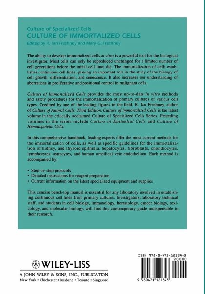 Culture of Specialized Cells Culture of Immortalized Cells Edited by R. Ian Freshney and Mary G. Freshney The ability to develop immortalized cells in vitro is a powerful tool for the biological investigator. Most cells can only be reproduced unchanged for a limited number of cell generations before the initial cell lines die. The immortalization of cells establishes continuous cell lines, playing an important role in the study of the biology of cell growth, differentiation, and senescence. It also increases our understanding of aberrations in proliferative and positional control in malignant cells. Culture of Immortalized Cells provides the most up-to-date in vitro methods and safety procedures for the immortalization of primary cultures of various cell types. Coedited by one of the leading figures in the field, R. Ian Freshney, author of Culture of Animal Cells, Third Edition, Culture of Immortalized Cells is the latest volume in the critically acclaimed Culture of Specialized Cells Series. Preceding volumes in the series include Culture of Epithelial Cells and Culture of Hematopoietic Cells. In this comprehensive handbook, leading experts offer the most current methods for the immortalization of cells, as well as specific guidelines for the immortalization of kidney, and thyroid epithelia, hepatocytes, fibroblasts, chondrocytes, lymphocytes, astrocytes, and human umbilical vein endothelium. Each method is accompanied by: * Step-by-step protocols * Detailed instructions for reagent preparation * Current information on the latest specialized equipment and supplies This concise bench-top manual is essential for any laboratory involved in establishing continuous cell lines from primary cultures. Investigators, laboratory technical staff, and students in cell biology, immunology, hematology, cancer biology, toxicology, and molecular biology, will find this contemporary guide indispensable to their research.