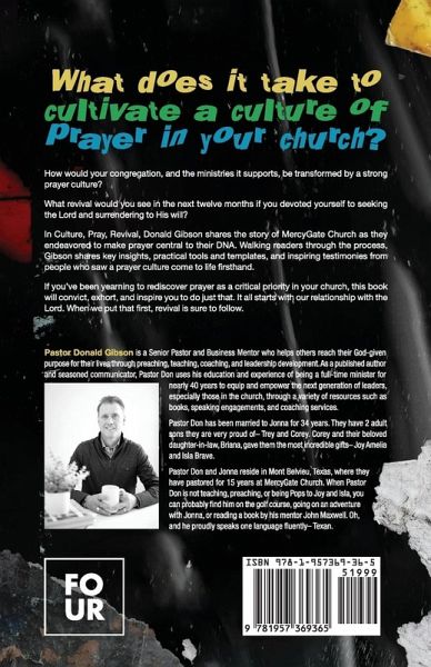 What does it take to cultivate a culture of prayer in your church?¿How would your congregation, and the ministries it supports, be transformed by a strong prayer culture? What revival would you see in the next twelve months if you devoted yourself to seeking the Lord and surrendering to His will? In Culture, Prayer, Revival, Donald Gibson shares the story of MercyGate Church as they endeavored to make prayer central to their DNA. Walking readers through the process, Gibson shares key insights, practical tools and templates, and inspiring testimonies from people who saw a prayer culture come to life firsthand. If you've been yearning to rediscover prayer as a critical priority in your church, this book will convict, exhort, and inspire you to do just that. It all starts with our relationship with the Lord. When we put that first, revival is sure to follow.
