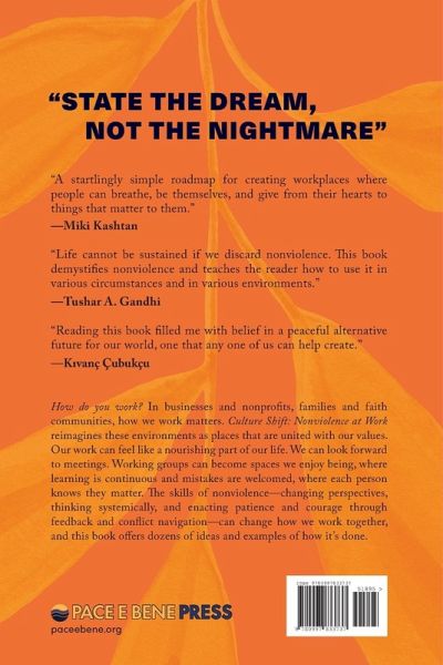 How do you work? In businesses and nonprofits, families and faith communities, how we work matters. Culture Shift: Nonviolence at Work reimagines these environments as places that are united with our values. Our work can feel like a nourishing part of our life. We can look forward to meetings. Working groups can become spaces we enjoy being, where learning is continuous and mistakes are welcomed, where each person knows they matter. The skills of nonviolence-changing perspectives, thinking systemically, and enacting patience and courage through feedback and conflict navigation-can change how we work together, and this book offers dozens of ideas and examples of how it's done.