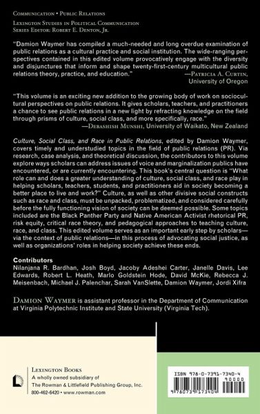 Culture, Race, and Class-Based Perspectives in Public Relations, edited by Damion Waymer, looks at "diversity in public relations" in a novel way. Several public relations books look at gender or transnational/global PR; however, this book foregrounds issues of culture, race, and class in public relations. Some topics included are the Black Panther Party and Native American Activist rhetorical PR, risk equity, critical race theory, and pedagogical approaches to teaching culture, race, and class.