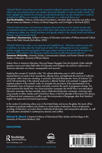 "Michael Olneck has written a very important and insightful book that helps the educator and general reader understand the meaning of the "Culture Wars" and their corrosive impact on education. Olneck gives necessary historical perspective and contextualization to this war over signs. With great analytic power and forcefulness, he makes clear the critical issues at stake in this conflagrating war over symbolism and the struggle over the iconography of the past, present and future that existentially threatens the autonomy of the teacher in the classroom and the very future of the educational enterprise."