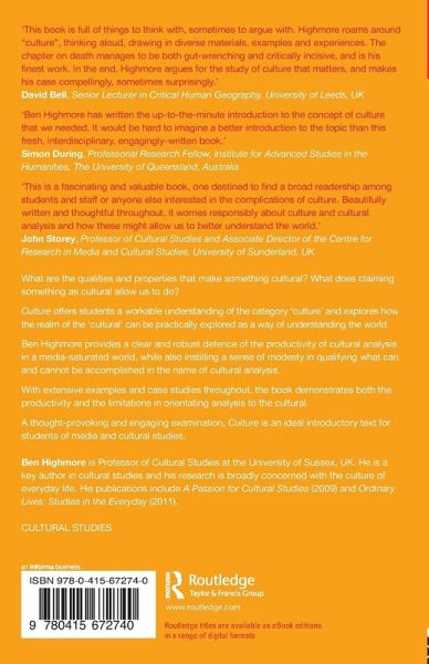 What are the qualities and properties that make something cultural? What does claiming something as cultural allow us to do? Culture offers students a workable understanding of the category 'culture' and explores how the realm of the 'cultural' can be practically explored as a way of understanding the world. Ben Highmore provides a clear and robust defence of the productivity of cultural analysis in a media saturated world, while also instilling a sense of modesty in qualifying what can and can't be accomplished in the name of cultural analysis. With extensive examples and case studies throughout, the book demonstrates both the productivity and the limitations in orientating analysis to the cultural. A thought-provoking and engaging examination, Culture is an ideal introductory text for students of media and cultural studies.
