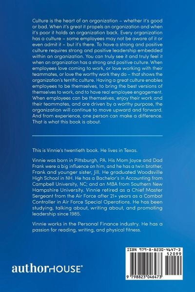 Culture is the heart of an organization - whether it's good or bad. When it's great it propels an organization and when it's poor it holds an organization back. Every organization has a culture - some employees may not be aware of it or even admit it - but it's there. To have a strong and positive culture requires strong and positive leadership embedded within an organization. You can truly see it and truly feel it when an organization has a strong and positive culture. When employees love coming to work, or love working with their teammates, or love the worthy work they do - that shows the organization's terrific culture. Having a great culture enables employees to be themselves, to bring the best versions of themselves to work, and to have real employee engagement. When employees can be themselves, enjoy their work and their teammates, and are driven by a worthy purpose, the organization will continue to move upward and forward. And from experience, one person can make a difference. That is what this book is about.