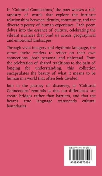 In "Cultured Connections," the poet weaves a rich tapestry of words that explore the intricate relationships between identity, community, and the diverse tapestry of human experience. Each poem delves into the essence of culture, celebrating the vibrant nuances that bind us across geographical and emotional landscapes. Through vivid imagery and rhythmic language, the verses invite readers to reflect on their own connections-both personal and universal. From the celebration of shared traditions to the pain of longing for understanding, this collection encapsulates the beauty of what it means to be human in a world that often feels divided. Join in the journey of discovery, as "Cultured Connections" reminds us that our differences can create bridges rather than barriers, and that the heart's true language transcends cultural boundaries.