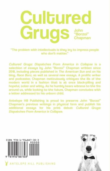 "The problem with intellectuals is they try to impress people who don't matter." Cultured Grugs: Dispatches from America in Collapse is a selection of essays by John "Borzoi" Chapman written since 2018, including pieces publishing in The American Sun and on his blog, Race Borz, as well as several new essays. A prolific writer and podcaster, Chapman meticulously critiques the ills of the modern world in a fashion that is at once black-pilling and hopeful, sober and witty. As he humbly bears witness to the fire around us, while looking to the future, Chapman concludes with a letter addressed to his unborn child. Antelope Hill Publishing is proud to preserve John "Borzoi" Chapman's previous writings in physical form and publish his additional essays for his print debut: Cultured Grugs: Dispatches From America in Collapse.