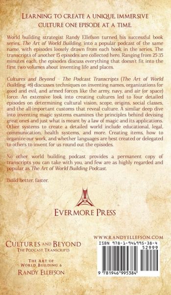 Learning to create a unique, immersive cultures one episode at a time. A guide for authors, gamers, and hobbyists World building strategist Randy Ellefson turned his successful book series, The Art of World Building, into a popular podcast of the same name, with episodes loosely drawn from each book in the series. The transcripts of another 15 episodes are collected here. Ranging from 25-35 minutes each, the episodes discuss everything that doesn't fit into the first two volumes about inventing life and places. Cultures and Beyond – The Podcast Transcripts (The Art of World Building, #6) discusses techniques on inventing names, organizations for good and evil, and armed forces like the army, navy, and air (or space) force. An extensive look into creating cultures led to four detailed episodes on determining cultural vision, scope, origins, social classes, and the all-important customs that reveal culture. A similar deep five into inventing magic systems examines the principles behind devising great ones and just what is meant by a law of magic and its applications. Other systems to create a detailed world include educational, legal, communication, health systems, and more. Creating items, how to organize our work, and whether languages are best created or delegated to others to invent for us round out the episodes. No other world building podcast provides a permanent copy of transcripts you can take with you, and few are as highly regarded and popular as The Art of World Building Podcast.