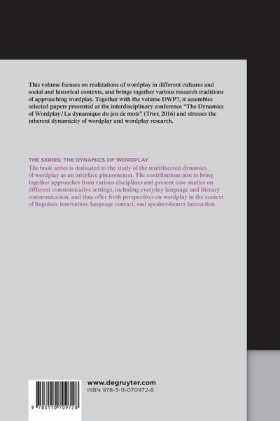 This volume focuses on realisations of wordplay in different cultures and social and historical contexts, and brings together various research traditions of approaching wordplay. Together with the volume DWP 7, it assembles selected papers presented at the interdisciplinary conference The Dynamics of Wordplay / La dynamique du jeu de mots (Trier, 2016) and stresses the inherent dynamicity of wordplay and wordplay research.