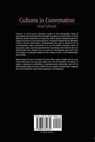 Cultures in Conversation introduces readers to the ethnographic study of intercultural and social interactions through the analysis of conversations in which various cultural orientations are operating. Author Donal Carbaugh presents his original research on conversation practices in England, Finland, Russia, Blackfeet County, and the United States, demonstrating how each is distinctive in its communication codes--particularly in its use of symbolic meanings, forms of interaction, norms, and motivational themes. Examining conversation in this way demonstrates how cultural lives are active in conversations and shows how conversation is a principal medium for the coding of selves, social relationships, and societies. Representing 20 years of research, this volume offers unique insights into the ways social interactions not only gain shape from, but also are formative of cultures. It makes a significant contribution to communication scholarship, and will be illuminating reading in courses focusing on cultural communication, language and social interaction, intercultural pragmatics, and linguistics.