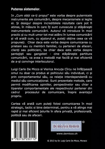 In Cum obtii ce-ti propui este vorba despre puternicele instrumente ale comunicarii, despre mecanismele si legile ei. Si desigur despre incredibilele rezultate care pot fi atinse, in masura in care iti sunt cunoscute si stapanesti instrumentele comunicarii. Autorul va introduce in mod practic si cu mult umor tot mai adanc in lumea comunicarii si va arata cum, cu ajutorul ei, puteti obtine ceea ce va propuneti. Chiar daca este vorba despre comunicarea cu prieteni sau cu membrii familiei, cu parteneri de afaceri, clienti sau politicieni, ba chiar daca este vorba despre santajisti sau gangsteri - cine stapaneste partitura comunicarii, va avea o metoda mai facila si mai eficienta de a-si convinge interlocutorul. Luigi Carlo De Micco si Viorica Ancuta Circu ne infatiseaza omul nu doar ca produs al psihicului sau individual, ci si prin comportamentul sau, ca relatie interdependenta cu mediul sau comunicational. Sunt prezentate metode, care permit modificarea opiniilor, perspectivelor sau chiar a tiparelor comportamentale ale respectivului partener din cadrul procesului de comunicare, inspre avantajul propriu. Cartea va arata cum puteti folosi comunicarea in mod strategic, tactic si bine determinat, pentru a va atinge mai rapid si mai eficient telurile in sfera privata, profesionala, politica sau de afaceri.
