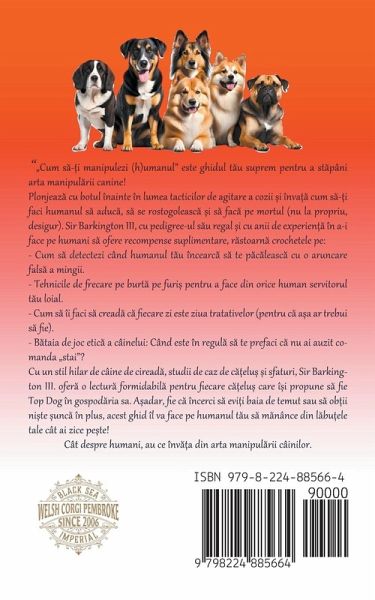 "Cum s¿-¿i manipulezi (h)umanul", este ghidul t¿u suprem pentru a st¿pâni arta manipul¿rii canine! Plonjeaz¿ cu botul înainte în lumea tacticilor de agitare a cozii ¿i învä¿ cum s¿-¿i faci humanul s¿ aduc¿, s¿ se rostogoleasc¿ ¿i s¿ fac¿ pe mortul (nu la propriu, desigur). Sir Barkington III, cu pedigree-ul s¿u regal ¿i cu anii de experien¿¿ în a-i face pe humani s¿ ofere recompense suplimentare, r¿stoarn¿ crochetele pe: - Cum s¿ detectezi când humanul t¿u încearc¿ s¿ te p¿c¿leasc¿ cu o aruncare fals¿ a mingii. - Tehnicile de frecare pe burt¿ pe furi¿ pentru a face din orice human servitorul t¿u loial. - Decodificarea comportamentelor ciudate ale humanului (cum ar fi de ce este obsedat de r¿h¿¿elul t¿u). - Cum s¿ îi faci s¿ cread¿ c¿ fiecare zi este ziua tratativelor (pentru c¿ äa ar trebui s¿ fie). - B¿taia de joc etic¿ a câinelui: Când este în regul¿ s¿ te prefaci c¿ nu ai auzit comanda "stai"? Cu un stil hilar de câine de ciread¿, studii de caz de c¿¿elü ¿i sfaturi care latr¿ de minune, Sir Barkington III. ofer¿ o lectur¿ formidabil¿ pentru fiecare c¿¿elü care î¿i propune s¿ fie Top Dog în gospod¿ria sa. A¿adar, fie c¿ încerci s¿ evi¿i baia de temut sau s¿ ob¿ii ni¿te ¿unc¿ în plus, acest ghid îl va face pe humanul t¿u s¿ m¿nânce din l¿büele tale cât ai zice pe¿te! Cât despre humani, au ce înv¿¿a din arta manipul¿rii câinilor.