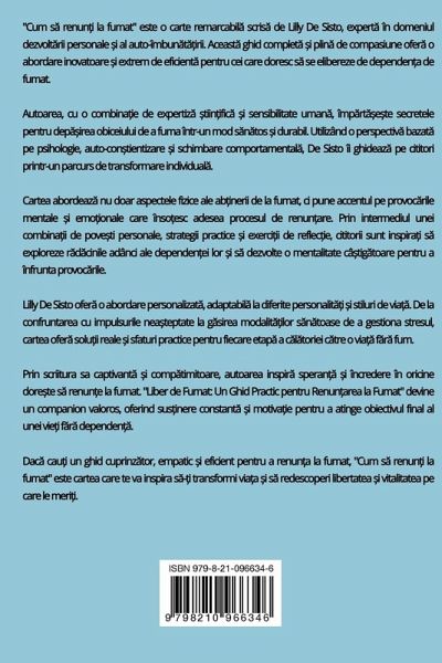 "Cum s¿ renun¿i la fumat" este o carte remarcabil¿ scris¿ de Lilly De Sisto, expert¿ în domeniul dezvolt¿rii personale ¿i al auto-îmbun¿t¿¿irii. Aceast¿ ghid complet¿ ¿i plin¿ de compasiune ofer¿ o abordare inovatoare ¿i extrem de eficient¿ pentru cei care doresc s¿ se elibereze de dependen¿a de fumat. Autoarea, cu o combinäie de expertiz¿ ¿tiin¿ific¿ ¿i sensibilitate uman¿, împ¿rt¿¿e¿te secretele pentru dep¿¿irea obiceiului de a fuma într-un mod s¿n¿tos ¿i durabil. Utilizând o perspectiv¿ bazat¿ pe psihologie, auto-con¿tientizare ¿i schimbare comportamental¿, De Sisto îi ghideaz¿ pe cititori printr-un parcurs de transformare individual¿. Cartea abordeaz¿ nu doar aspectele fizice ale ab¿inerii de la fumat, ci pune accentul pe provoc¿rile mentale ¿i emöionale care însöesc adesea procesul de renun¿are. Prin intermediul unei combinäii de pove¿ti personale, strategii practice ¿i exerci¿ii de reflec¿ie, cititorii sunt inspiräi s¿ exploreze r¿d¿cinile adânci ale dependen¿ei lor ¿i s¿ dezvolte o mentalitate câ¿tig¿toare pentru a înfrunta provoc¿rile. Lilly De Sisto ofer¿ o abordare personalizat¿, adaptabil¿ la diferite personalit¿¿i ¿i stiluri de viä¿. De la confruntarea cu impulsurile neäteptate la g¿sirea modalit¿¿ilor s¿n¿toase de a gestiona stresul, cartea ofer¿ solüii reale ¿i sfaturi practice pentru fiecare etap¿ a c¿l¿toriei c¿tre o viä¿ f¿r¿ fum. Prin scriitura sa captivant¿ ¿i comp¿timitoare, autoarea inspir¿ speran¿¿ ¿i încredere în oricine dore¿te s¿ renun¿e la fumat. "Liber de Fumat: Un Ghid Practic pentru Renun¿area la Fumat" devine un companion valoros, oferind sus¿inere constant¿ ¿i motiväie pentru a atinge obiectivul final al unei vie¿i f¿r¿ dependen¿¿. Dac¿ caüi un ghid cuprinz¿tor, empatic ¿i eficient pentru a renun¿a la fumat, "Cum s¿ renun¿i la fumat" este cartea care te va inspira s¿-¿i transformi viäa ¿i s¿ redescoperi libertatea ¿i vitalitatea pe care le meri¿i.