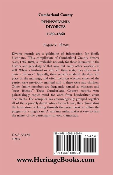 Divorce records are a goldmine of information for family historians. "This compilation of Cumberland County divorce cases, 1789-1860, is invaluable not only for those interested in the history and genealogy of that area, but many other locations as well. When a husband or wife left their mate, they often went quite a distance." Typically, these records establish the date and place of the marriage, and often mention whether either of the parties were previously married and if there were any children. Other family members are frequently named as witnesses and "next friends." These Cumberland County records were painstakingly copied word for word from handwritten court documents. The compiler has chronologically grouped together all of the separately dated entries for each case, thus eliminating the frustration of leafing through the entire book to follow the progress of a single case. A surname index makes it easy to find the names of the participants in each transaction.