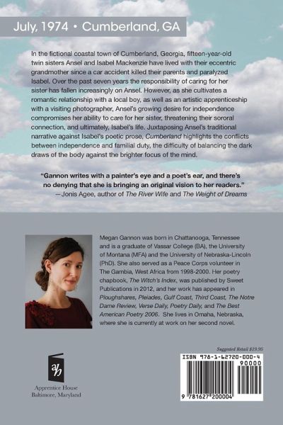 In the fictional coastal town of Cumberland, Georgia, fifteen-year-old twin sisters Ansel and Isabel Mackenzie have lived with their eccentric grandmother since a car accident killed their parents and paralyzed Isabel. Over the past seven years the responsibility of caring for her sister has fallen increasingly on Ansel. However, as she cultivates a romantic relationship with a local boy, as well as an artistic apprenticeship with a visiting photographer, Ansel's growing desire for independence compromises her ability to care for her sister, threatening their sororal connection, and ultimately, Isabel's life. Juxtaposing Ansel's traditional narrative against Isabel's poetic prose, Cumberland highlights the conflicts between independence and familial duty, the difficulty of balancing the dark draws of the body against the brighter focus of the mind. Megan Gannon was born in Chattanooga, Tennessee and is a graduate of Vassar College (BA), the University of Montana (MFA) and the University of Nebraska-Lincoln (PhD). She also served as a Peace Corps volunteer in The Gambia, West Africa from 1998-2000. Her poetry chapbook, The Witch's Index, was published by Sweet Publications in 2012, and her work has appeared in Ploughshares, Pleiades, Gulf Coast, Third Coast, The Notre Dame Review, Verse Daily, Poetry Daily, and The Best American Poetry 2006. She lives in Omaha, Nebraska, where she is currently at work on her second novel.
