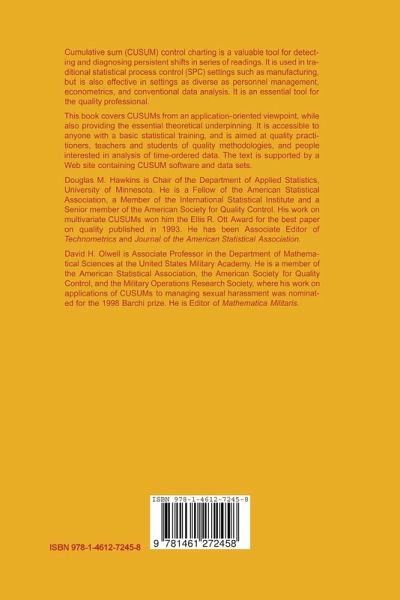 Cumulative sum (CUSUM) control charting is a valuable tool for detecting and diagnosing persistent shifts in series of readings. It is used in traditional statistical process control (SPC) settings such as manufacturing, but is also effective in settings as diverse as personnel management, econometrics, and conventional data analysis. It is an essential tool for the quality professional. This book covers CUSUMs from an application-oriented viewpoint, while also providing the essential theoretical underpinning. It is accessible to anyone with a basic statistical training, and is aimed at quality practitioners, teachers and students of quality methodologies, and people interested in analysis of time-ordered data. The text is supported by a Web site containing CUSUM software and data sets. Douglas M. Hawkins is Chair of the Department of Applied Statistics, University of Minnesota. He is a Fellow of the American Statistical Association, a Member of the International Statistical Institute and a Senior member of the American Society for Quality Control. His work on multivariate CUSUMs won him the Ellis R. Ott Award for the best paper on quality published in 1993. He has been Associate Editor of Technometrics and Journal of the American Statistical Association. David H. Olwell is Associate Professor in the Department of Mathematical Sciences at the United States Military Academy. He is a member of the American Statistical Association, the American Society for Quality Control, and the Military Operations Research Society, where his work on applications of CUSUMs to managing sexual harassment was nominated for the 1998 Barchi prize. He is Editor of Mathematica