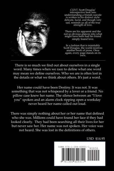 CUNT, Scott Douglas' introspective look into understanding a friends suicide is written in his distinct style: delicate, lucid, and though very sad, reminds us all of the true strength of love. There are his apparent and the not so obvious glances into what might have been had his friend simply found love. In a fashion that is inimitably Scott Douglas, the world receives another book of prose. Once again, every page stands on its own. There is so much we find out about ourselves in a single word. Many times when we race to define what one word may mean we define ourselves. Who we are is often lost in the details or what we think about others. It's just a word. There was simply nothing about her or her name that defined who she was. Millions could have found her face if they had looked clearly. They had been searching all their lives for her but never saw her. Her name was not spoken. Her voice was not heard. She was lost in the definitions of others.