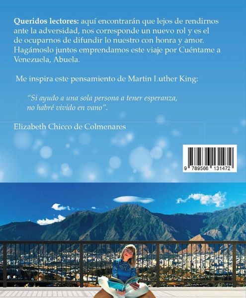 Es un libro que describe la historia de amor al país que te vio nacer, donde se narra, se describe y se recrea con honra, ese amor a la madre patria. Es un paseo, es un viaje para recorrerlo juntos. Como toda historia de amor, está llena de momentos mágicos, reales, significativos, soñados; cargados de esperanza, de reflexión y de no olvido; por lo grande que fue, lo que es y por lo que nos corresponde hacer para que el final de esa historia de amor profundice su raíz y le demos fuerza alrededor del mundo. Es un soplo de optimismo narrado de una forma amena y amorosa con gran respeto y con la ilusión de llegar a las manos de cada corazón enamorado que habita este universo, porque somos seres universalmente conectados y la tierra es digna de ser amada. Leer este libro es una oportunidad de ver en lo sencillo las grandezas de la vida. Es un tesoro para compartir para que Venezuela transcienda de abuelos a nietos, de padres a hijos, de generación en generación, de país en país. Haz tuyo este libro y atesóralo.