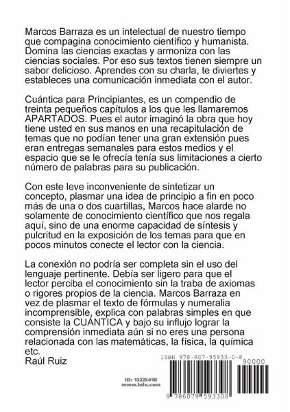Marcos Barraza es un intelectual de nuestro tiempo que compagina conocimiento científico y humanista. Domina las ciencias exactas y armoniza con las ciencias sociales. Por eso sus textos tienen siempre un sabor delicioso. Aprendes con su charla, te diviertes y estableces una comunicación inmediata con el autor. Cuántica para Principiantes, es un compendio de treinta pequeños capítulos a los que les llamaremos APARTADOS. Pues el autor imaginó la obra que hoy tiene usted en sus manos en una recapitulación de temas que no podían tener una gran extensión buscando fueran más amenos que académicos.