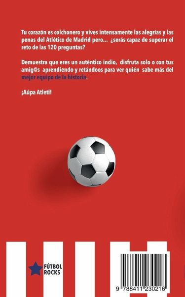 Un libro del Atlético de Madrid diferente. ¿Buscas el regalo perfecto para un hincha del Atlético de Madrid? ¡Lo has encontrado! Este original libro con 120 preguntas sobre el equipo colchonero sorprenderá a cualquier seguidor rojiblanco. Una oportunidad única para poner a prueba sus conocimientos y para aprender sobre la historia del mítico equipo madrileño. El pasado y el presente se unen para que las viejas y nuevas generaciones conversen y disfruten de tiempo juntos rememorando y conociendo más a fondo la historia del Atleti. Un libro de fútbol diferente, un regalo único para amigos, familiares y parejas fans del Atleti. Adecuado para todas las edades. Pasa un buen rato, solo o con amigos, con este cuestionario de 120 preguntas sobre el equipo rojiblanco, ¿te atreves? Para entretenerse en viajes, tardes entre amigos y cualquier ocasión en la que quieras divertirte mientras pones a prueba tus conocimientos sobre el equipo de tu vida. Para seguidores del Atlético de Madrid cualquier edad. Incluye las respuestas.