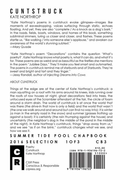 Things at the edge are at the center of Kate Northrop’s cuntstruck: a man squatting on a roof with his arms around his knees, kids running over the roofs of row houses at night, ghost decorations tied into trees, the unfocused eyes of the Scrambler attendant at the fair, the circle of foam around a storm drain. The world of cuntstruck is at once the world that was there (the drive-in that now is only a field) and the world that wasn’t (the one we walk around and around but can find no way into); it is winter (a man in the empty road in the snow) and summer (grasses frothing up against a boat); it is certainty (the rain thumping against the house) and uncertainty (the neighbor’s dog in the middle of the pond in the middle of the night). In Kate Northrop’s cuntstruck, things "drop away from us," and we see "as if on the brink." cuntstruck changes what we see, and how we see it.