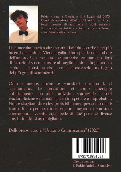Una raccolta poetica che mostra i lati più oscuri e i lati più lucenti dell'anima. Viene a galla il lato poetico dell'odio e dell'amore. Una raccolta che potrebbe sembrare un libro di istruzioni su come usare al meglio l'anima, imparando a capire e a capirsi, ma che in conclusione è solo un disegno dei più grandi sentimenti. Odio e amore, anche se emozioni contrastanti, ci accomunano. Le sensazioni ci fanno interagire chimicamente con altri individui, scaturendo in noi reazioni fisiche e mentali, spesso inaspettate o improbabili. Non è sbagliato dire che, probabilmente, questa raccolta è frutto di un percorso tortuoso, un uragano di emozioni contrastanti, avvertite sulla pelle di due persone diverse che, in fondo, si assomigliano. Dello stesso autore "Uragano Contronatura" (2020).