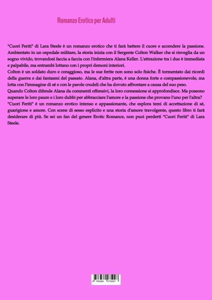 "Cuori Feriti" di Lara Steele è un romanzo erotico che ti farà battere il cuore e accendere la passione. Ambientato in un ospedale militare, la storia inizia con il Sergente Colton Walker che si risveglia da un sogno vivido, trovandosi faccia a faccia con l'infermiera Alana Keller. L'attrazione tra i due è immediata e palpabile, ma entrambi lottano con i propri demoni interiori.Colton è un soldato duro e coraggioso, ma le sue ferite non sono solo fisiche. È tormentato dai ricordi della guerra e dai fantasmi del passato. Alana, d'altra parte, è una donna forte e compassionevole, ma lotta con l'immagine di sé e con le parole crudeli che ha dovuto affrontare a causa del suo peso.Quando Colton difende Alana da commenti offensivi, la loro connessione si approfondisce. Ma possono superare le loro paure e i loro dubbi per abbracciare l'amore e la passione che provano l'uno per l'altra?"Cuori Feriti" è un romanzo erotico intenso e appassionante, che esplora temi di accettazione di sé, guarigione e amore. Con scene di sesso esplicito e una storia d'amore travolgente, questo libro ti farà desiderare di più. Se sei un fan del genere Erotic Romance, non puoi perderti "Cuori Feriti" di Lara Steele.
