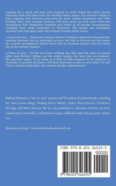 Looking for a quick and easy cozy mystery to read? Enjoy two short stories featuring Milo and Jules from the Finding Home series. Our favorite couple is busy juggling time between preparing for Jules' college graduation and Milo building their new catering business. The pace picks up even more when the sweethearts find themselves targeted and swept up in murder investigations troubling their small hometown of Keeferton. The stories are standalone episodes that take place after the original Finding Home series. A Cup of Secrets -- Debutante Chelsea Parker's birthday celebration launched his catering business into an overnight success, but Milo is thrown into the center of a murder investigation before dawn with his business partner and love of his life as the primary suspect. A Trace of Lace -- On the eve of his wedding day, Milo gets the news of a serial killer near Birston College and the entire campus has been put on lockdown. His guardian angel, Traci, steps in to help as Milo prepares to do whatever is necessary to protect his fiance. Will they intervene in time to save Jules? Or will Traci's intuition lead them into another deadly confrontation?
