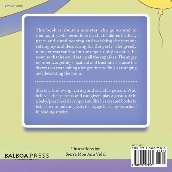 This book is about a monster who go around to communities whenever there is a child/children birthday party and stand peeping and watching the persons setting up and decorating for the party. The greedy monster was waiting for the opportunity to enter the room so that he could eat up the all the cupcake. The angry monster was getting impatient because frustrated because the persons was taking too long to finish setting up the room.
