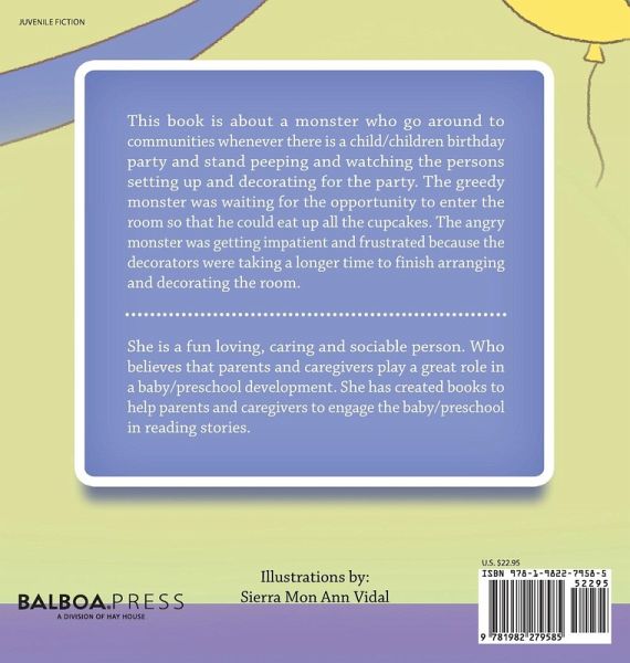 This book is about a monster who go around to communities whenever there is a child/children birthday party and stand peeping and watching the persons setting up and decorating for the party. The greedy monster was waiting for the opportunity to enter the room so that he could eat up the all the cupcake. The angry monster was getting impatient because frustrated because the persons was taking too long to finish setting up the room.