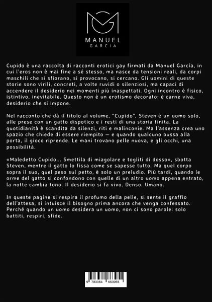 Cupido è una raccolta di racconti erotici gay firmati da Manuel García, in cui l'eros non è mai fine a sé stesso, ma nasce da tensioni reali, da corpi maschili che si sfiorano, si provocano, si cercano. Gli uomini di queste storie sono virili, concreti, a volte ruvidi o silenziosi, ma capaci di accendere il desiderio nei momenti più inaspettati. Ogni incontro è fisico, istintivo, inevitabile. Questo non è un erotismo decorato: è carne viva, desiderio che si impone.Nel racconto che dà il titolo al volume, "Cupido", Steven è un uomo solo, alle prese con un gatto dispotico e i resti di una storia finita. La quotidianità è scandita da silenzi, riti e malinconie. Ma l'assenza crea uno spazio che chiede di essere riempito - e quando qualcuno bussa alla porta, il gioco riprende. Le mani trovano pelle nuova, e gli occhi, una possibilità.«Maledetto Cupido... Smettila di miagolare e togliti di dosso», sbotta Steven, mentre il gatto lo fissa come se sapesse tutto. Ma quel corpo sopra il suo, quel peso sul petto, è solo un preludio. Più tardi, quando le orme del gatto si confondono con quelle di un altro uomo appena entrato, la notte cambia tono. Il desiderio si fa vivo. Denso. Umano.In queste pagine si respira il profumo della pelle, si sente il graffio dell'attesa, si intuisce il bisogno prima ancora che venga confessato. Perché quando un uomo desidera un uomo, non ci sono parole: solo battiti, respiri, sfide.