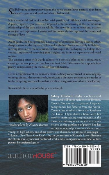Skillfully using contemporary idiom, this poetic drama shows a natural abundance of creative genius and speaks of what is fashionable. It is a wonderful fusion of intellect with passion, of diffidence with stereotype. A poetry apart, Clyke resists an imposed order in arriving at the harmonious relationship of the parts with the whole. Her power is in her sureness and mastery of subject and expression. Concise and luminous, she has captured the nature and essence of love. Avant-garde, she finds genuinely novel ways of expression, leaving a lasting effect, sharply aware of the mystery of life and suffering. Poems so vividly individual, inviting attention to the circumstances that shaped them, shaping the feelings they convey. Impassioned reasoning gives insights into intimate experience and social motive. This amazing artist with words adheres to a metrical plan in her composition, creating concrete poetry-complete and inviolable. She turns the unpoetic into poetry, compounding the matter-of-fact with fantasy. Life is a condition of flux and momentariness finely concentrated in love, longing, wanting, pining. Her poems are sly, ironic, and a bit cagey, enchanting the reader. A fresh and springy metrical form that reveals an imagination of what is bewildering. Remarkable. It is an indubitable poetic triumph.