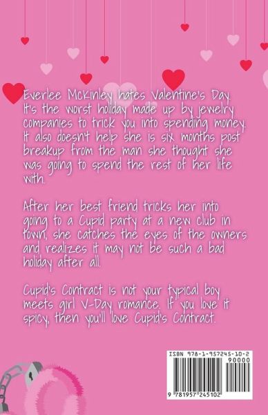 Everlee McKinley hates Valentine's Day. It's the worst holiday made up by jewelry companies to trick you into spending money. It also doesn't help she is six months post breakup from the man she thought she was going to spend the rest of her life with. After her best friend tricks her into going to a Cupid party at a new club in town, she catches the eyes of the owners, and realizes it may not be such a bad holiday after all. Cupid's Contract is not your typical boy meets girl V-Day romance. If you love it spicy, then you'll love Cupid's Contract.