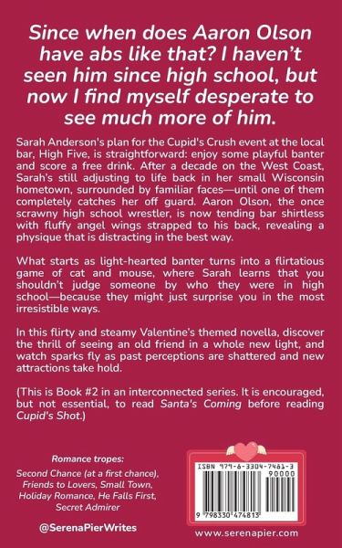 Since when does Aaron Olson have abs like that? I haven't seen him since high school, but now I find myself desperate to see much more of him. Sarah Anderson's plan for the Cupid's Crush event at the local bar, High Five, is straightforward: enjoy some playful banter and score a free drink. After a decade on the West Coast, Sarah's still adjusting to life back in her small Wisconsin hometown, surrounded by familiar faces-until one of them completely catches her off guard. Aaron Olson, the once scrawny high school wrestler, is now tending bar shirtless with fluffy angel wings strapped to his back, revealing a physique that is distracting in the best way. What starts as light-hearted banter turns into a flirtatious game of cat and mouse, where Sarah learns that you shouldn't judge someone by who they were in high school-because they might just surprise you in the most irresistible ways. In this flirty and steamy Valentine's themed novella, discover the thrill of seeing an old friend in a whole new light, and watch sparks fly as past perceptions are shattered and new attractions take hold. (This is Book #2 in an interconnected series. It is encouraged, but not essential, to read Santa's Coming before reading Cupid's Shot.) Romance Tropes: Second Chance (at a first chance), Friends to Lovers, Small Town, Holiday Romance, He Falls First, Secret Admirer